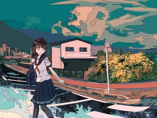 320x240 девушка, школьница, дорога, отражение, аниме, арт обои nokia e72, e71, asha, alcatel onetouch