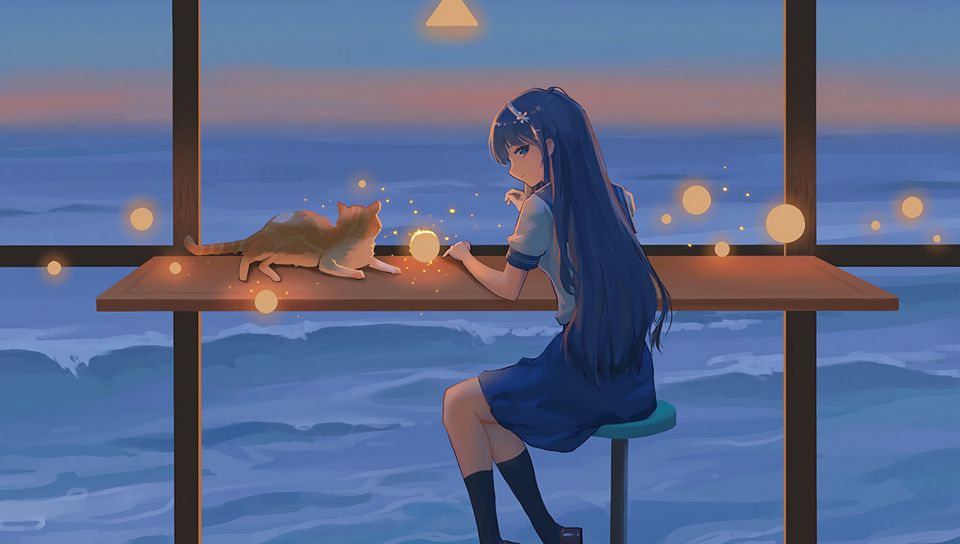 960x544 девушка, школьница, кот, свет, искры, сумерки, аниме обои playstation ps vita