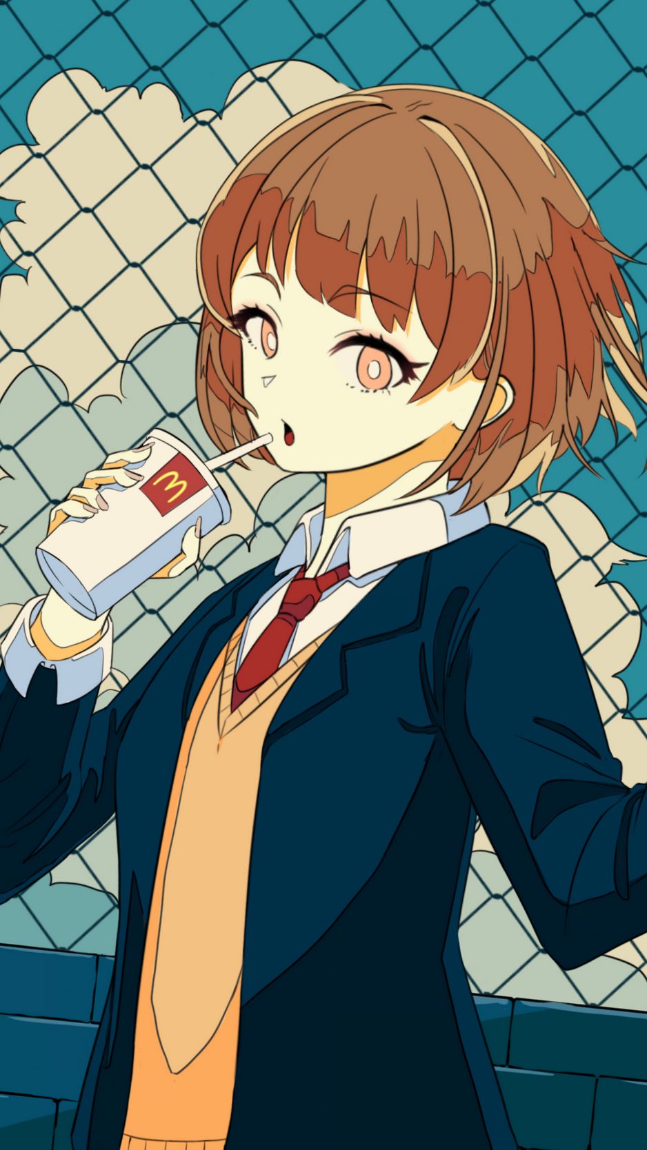 938x1668 девушка, школьница, напиток, стаканчик, аниме обои iphone 8/7/6s/6 for parallax