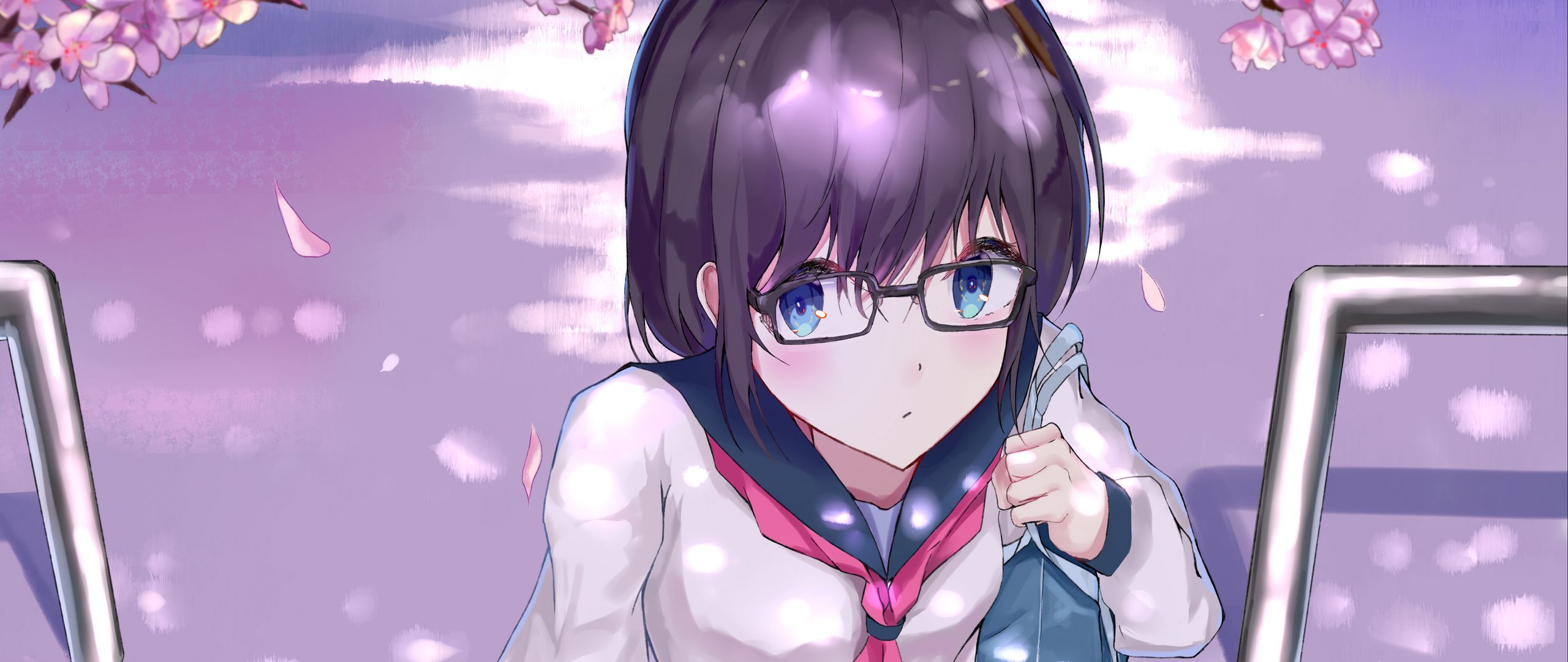 2560x1080 девушка, школьница, очки, форма, сакура, цветы, аниме обои два монитора 1080p