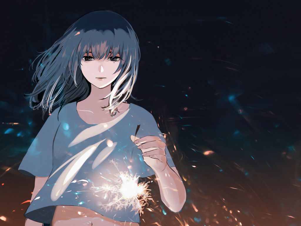 1024x768 девушка, слезы, грусть, искры, аниме, арт обои стандарт 4:3