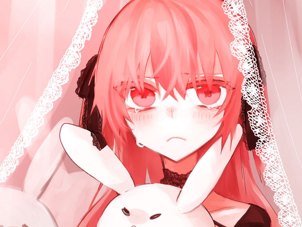 1024x768 девушка, слезы, грусть, заяц, игрушка, аниме обои стандарт 4:3