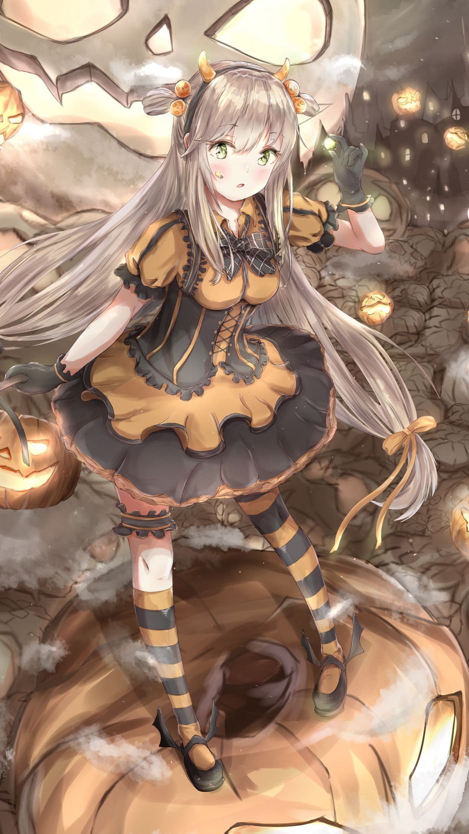 938x1668 девушка, тыквы, хэллоуин, аниме, арт обои iphone 8/7/6s/6 for parallax