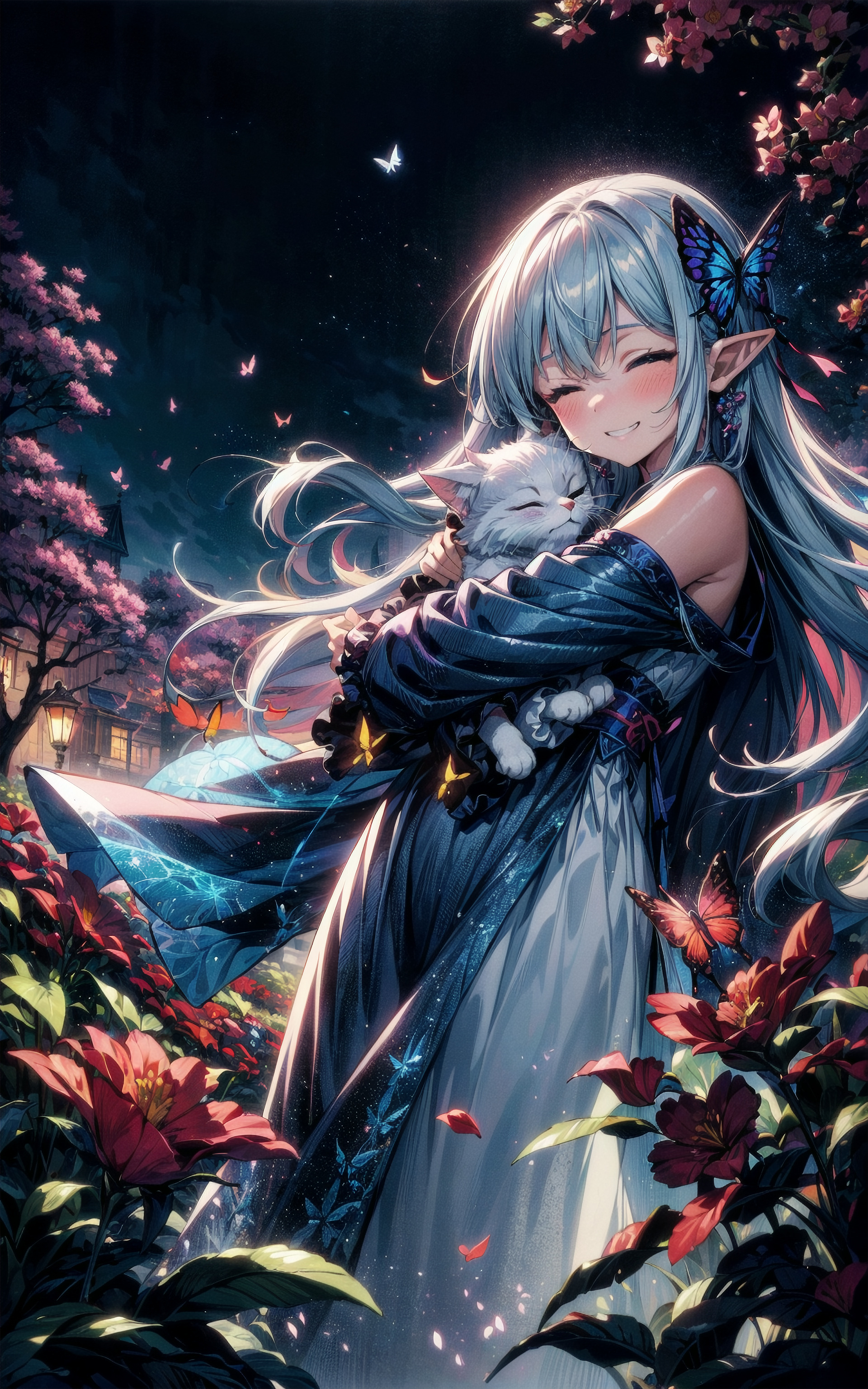 1920x3072 девушка, улыбка, эльф, кот, бабочка, аниме, арт обои