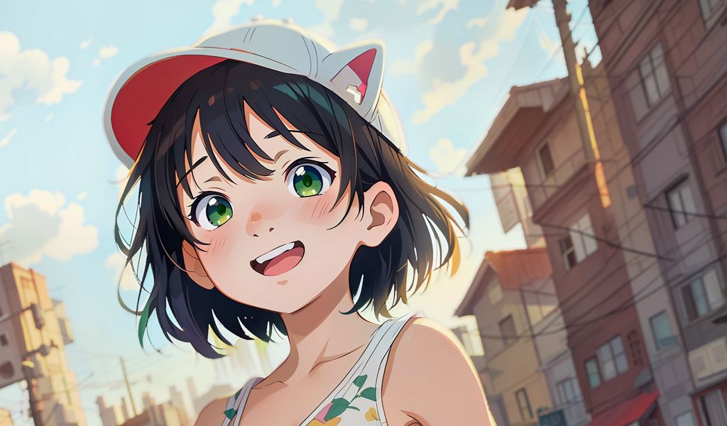 1024x600 девушка, улыбка, кепка, ушки, платье, аниме обои нетбук, планшет
