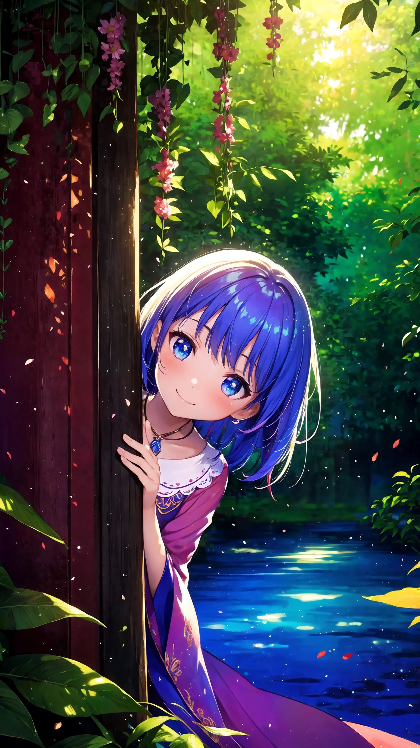 1350x2400 девушка, улыбка, прятаться, листья, цветы, аниме обои iphone 8+/7+/6s+/6+ for parallax