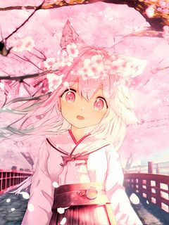240x320 девушка, ушки, неко, кимоно, цветы, весна, аниме обои мобильный телефон, смартфон