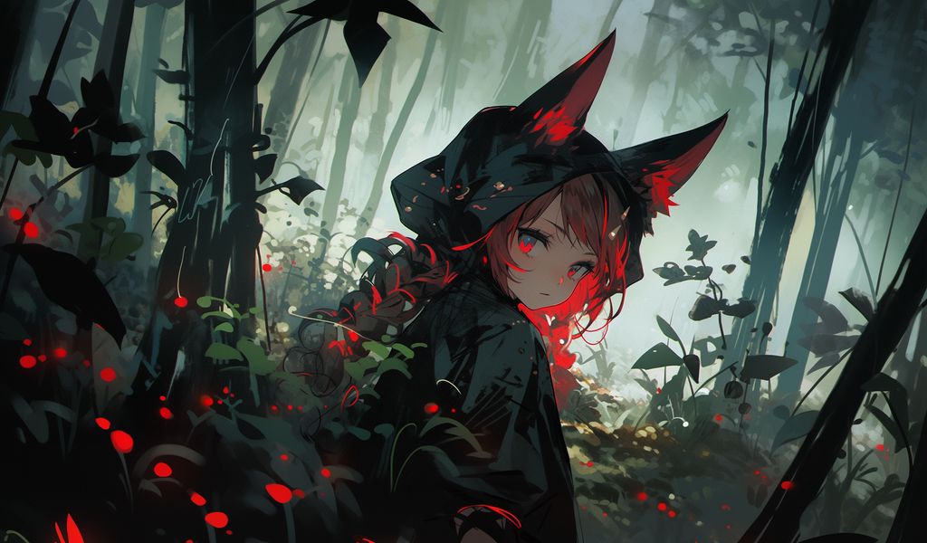 1024x600 девушка, ушки, плащ, лес, цветы, аниме, арт обои нетбук, планшет