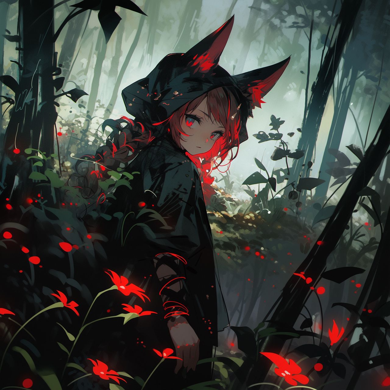 1280x1280 девушка, ушки, плащ, лес, цветы, аниме, арт обои ipad, ipad 2, ipad mini for parallax