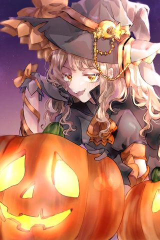 320x480 девушка, ведьма, шляпа, тыквы, хеллоуин, аниме обои samsung galaxy ace gt-s5830, sony xperia e, miro, htc wildfire s, c, lg optimus