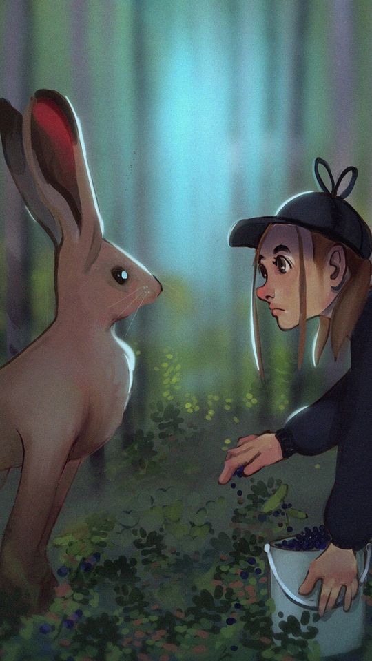 540x960 девушка, заяц, встреча, лес, арт обои samsung galaxy s4 mini, microsoft lumia 535, philips xenium, lg l90, htc sensation