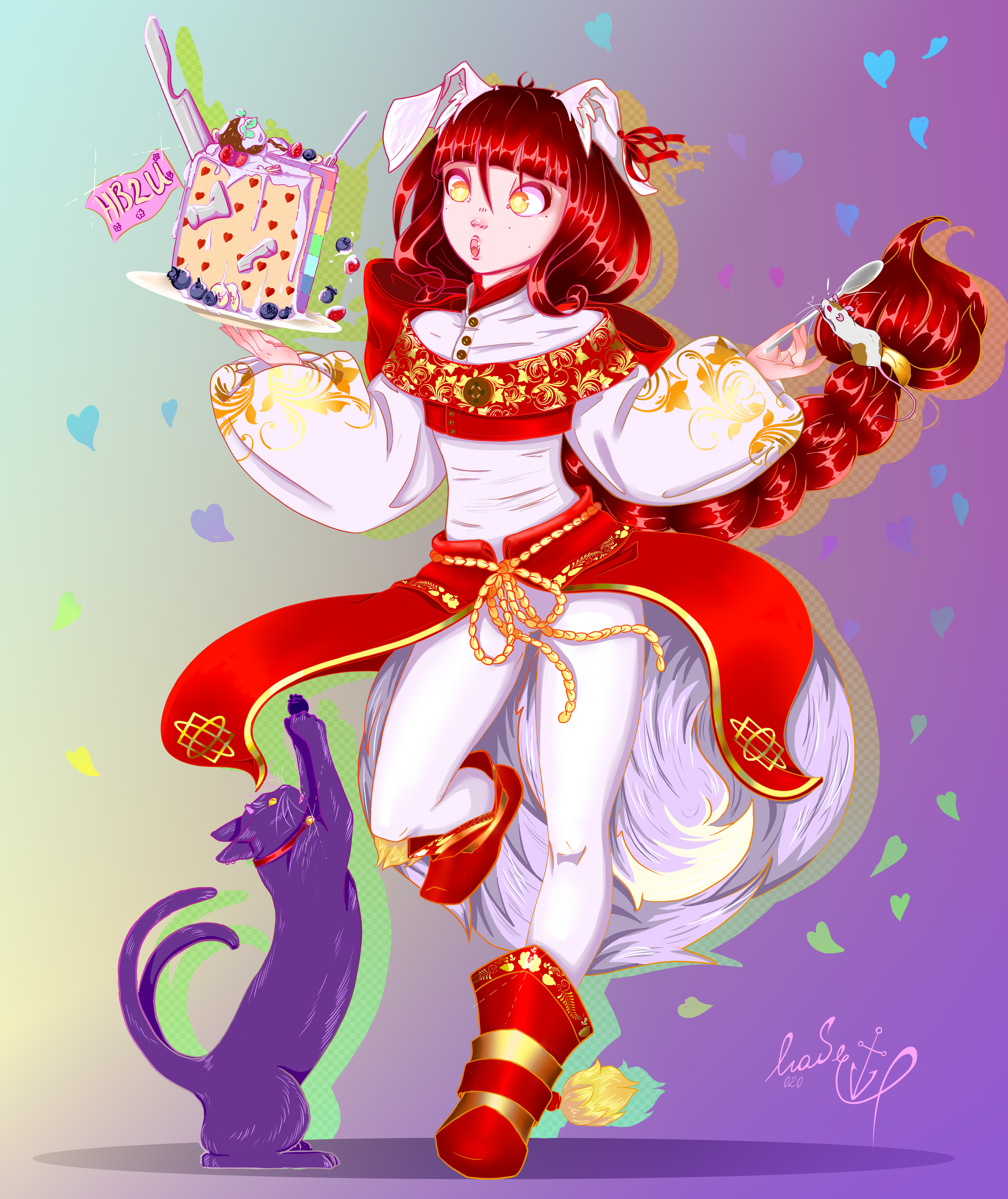 5900x7019 девушка-собака, девушка, торт, кошка, аниме, арт обои