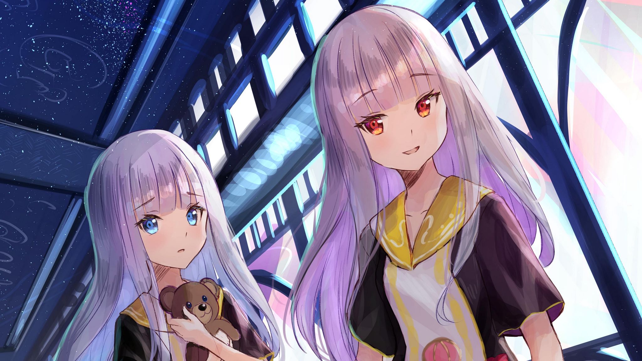 2048x1152 девушки, сестры, игрушки, аниме обои ультраширокий монитор