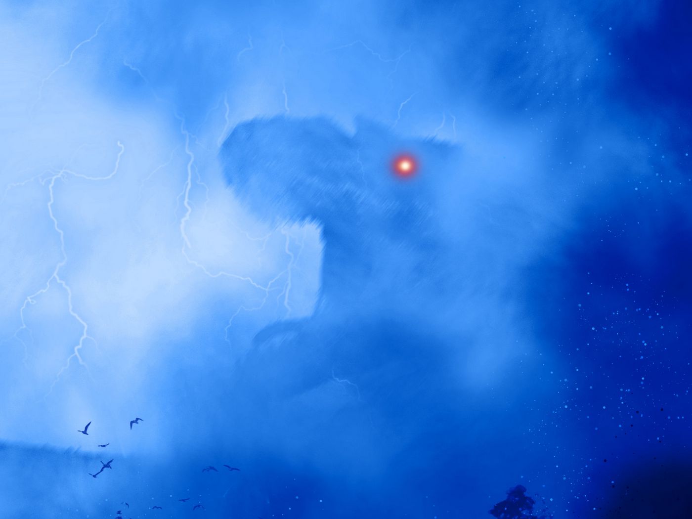 1400x1050 динозавр, монстр, силуэт, арт, туман, молнии обои стандарт 4:3
