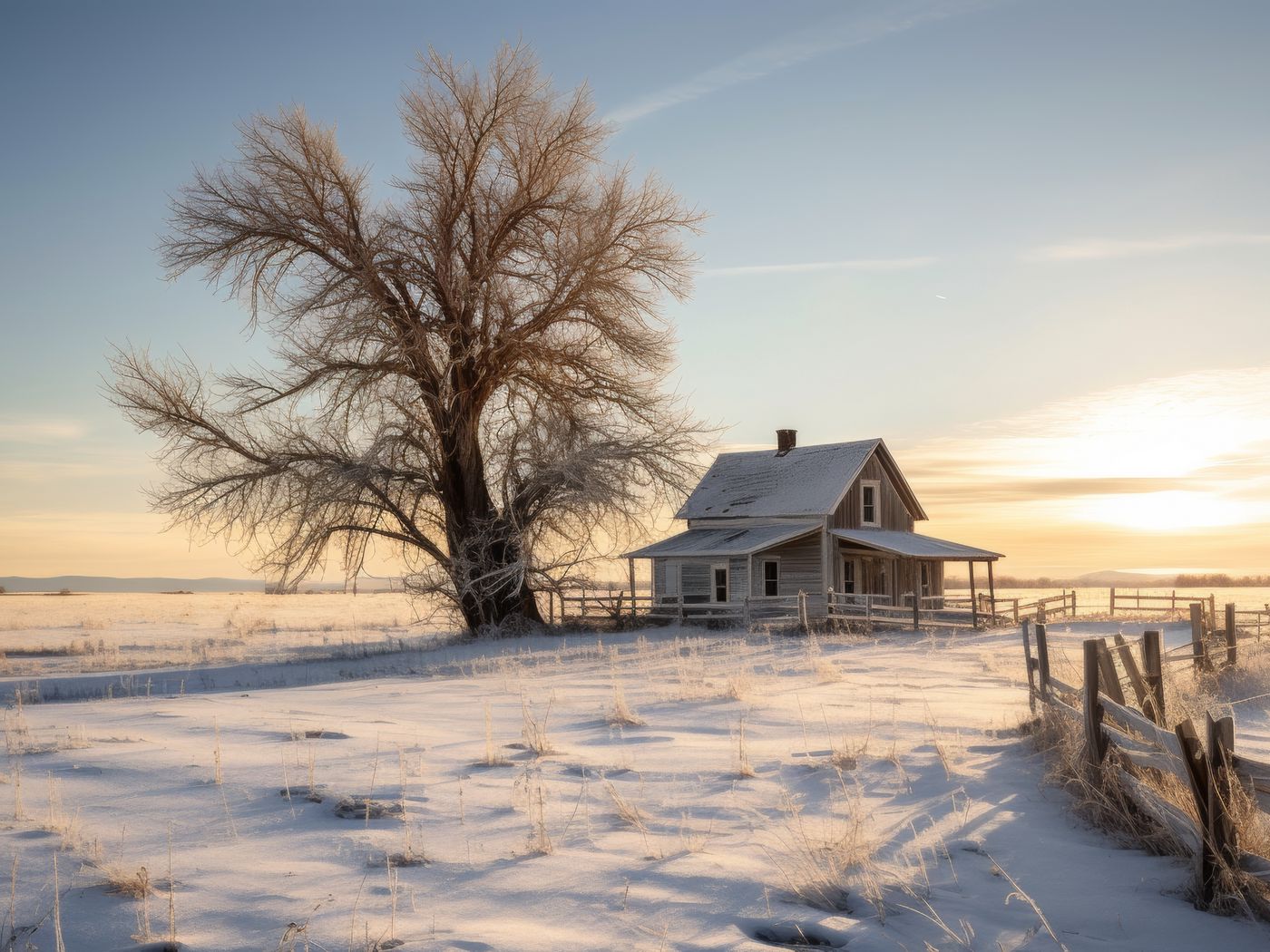 1400x1050 дом, дерево, снег, зима, закат обои стандарт 4:3