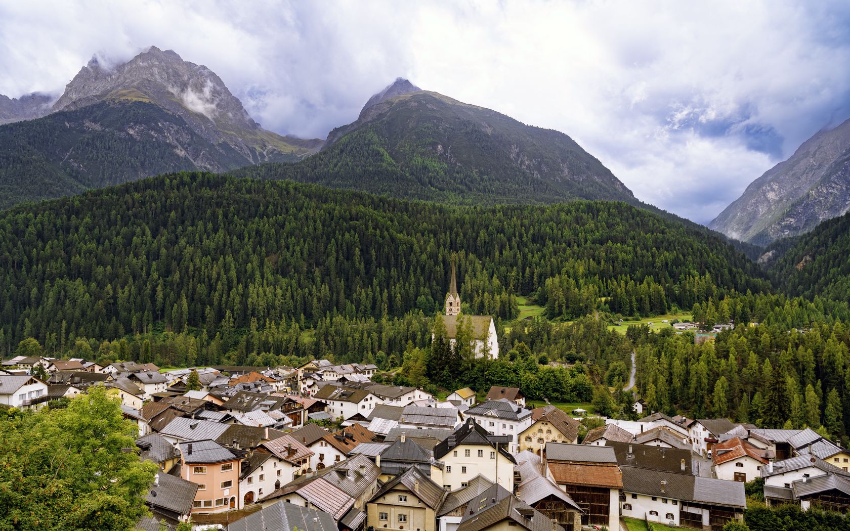 1680x1050 дома, деревья, лес, горы, холмы, вид обои 16:10