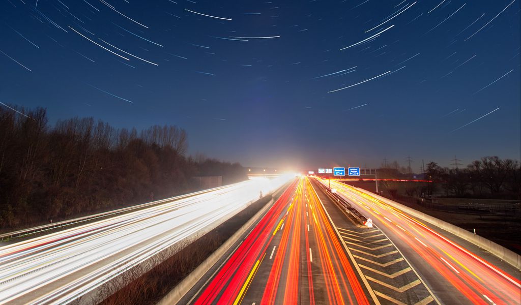1024x600 дорога, длительное воздействие, ночь, движение, подсветка, звездное небо обои нетбук, планшет