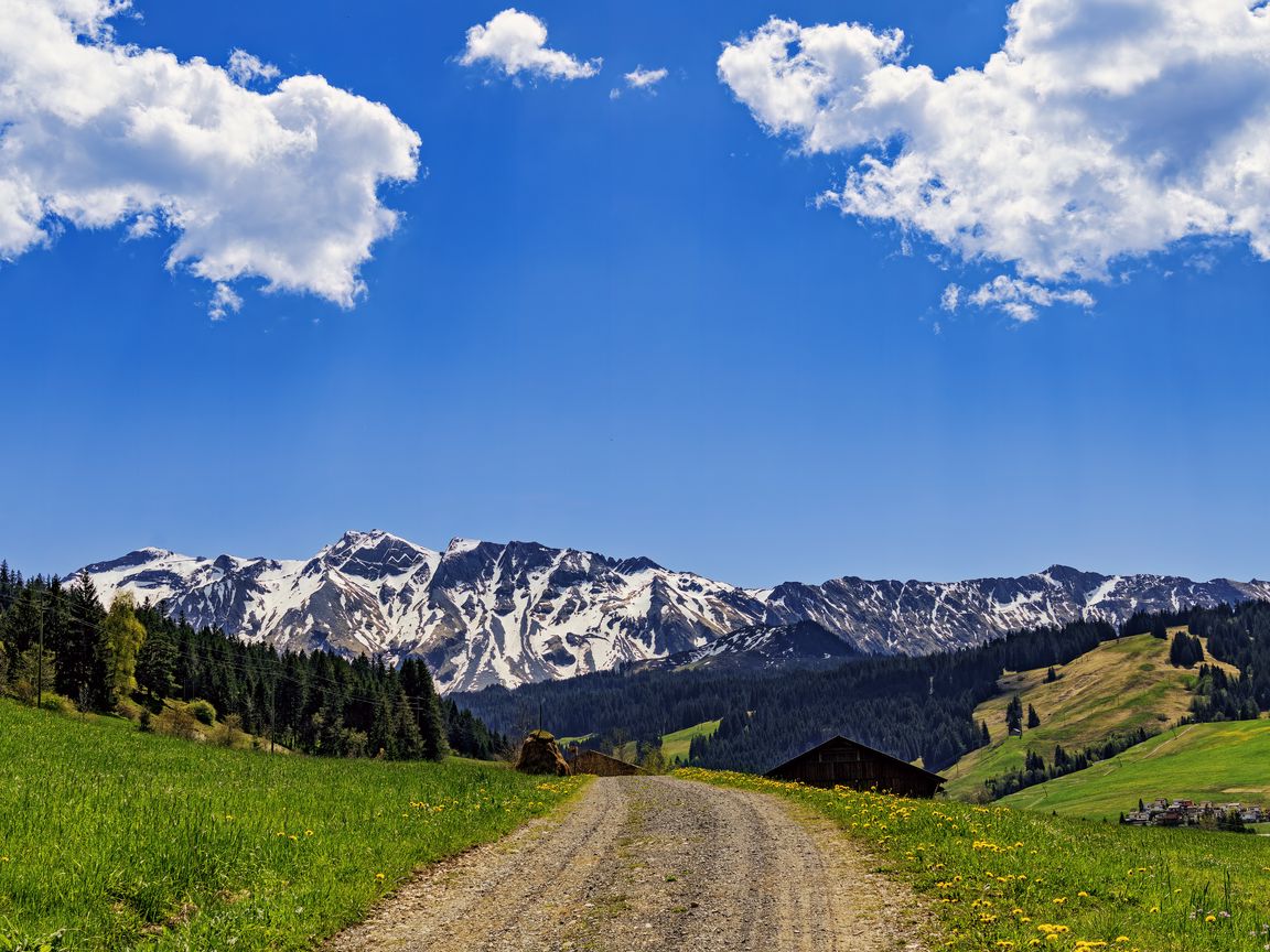 1152x864 дорога, поля, деревья, горы, облака, природа обои стандарт 4:3