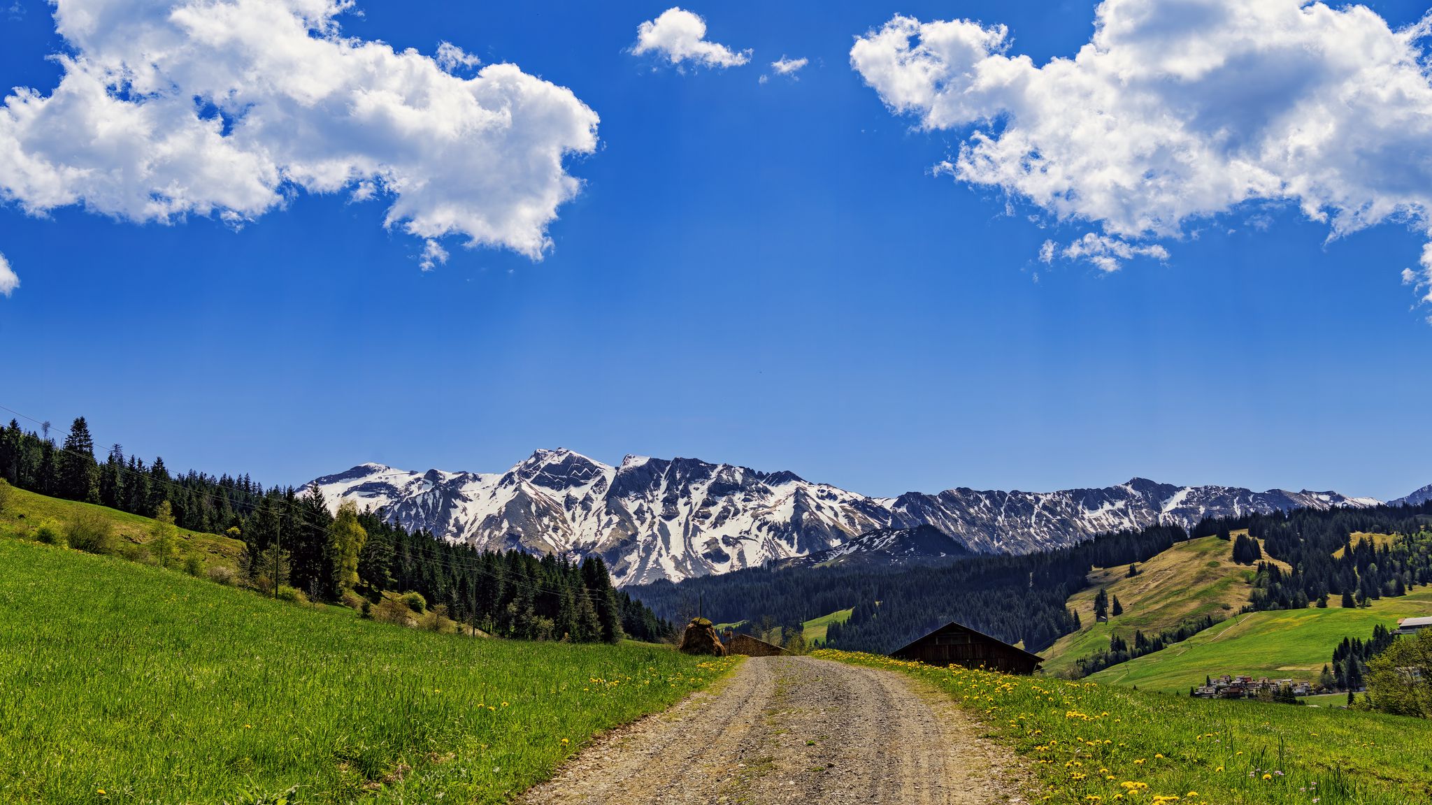 2048x1152 дорога, поля, деревья, горы, облака, природа обои ультраширокий монитор
