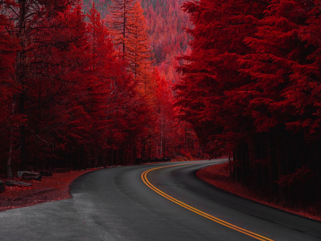 1024x768 дорога, поворот, деревья, красный, гора, пейзаж обои стандарт 4:3