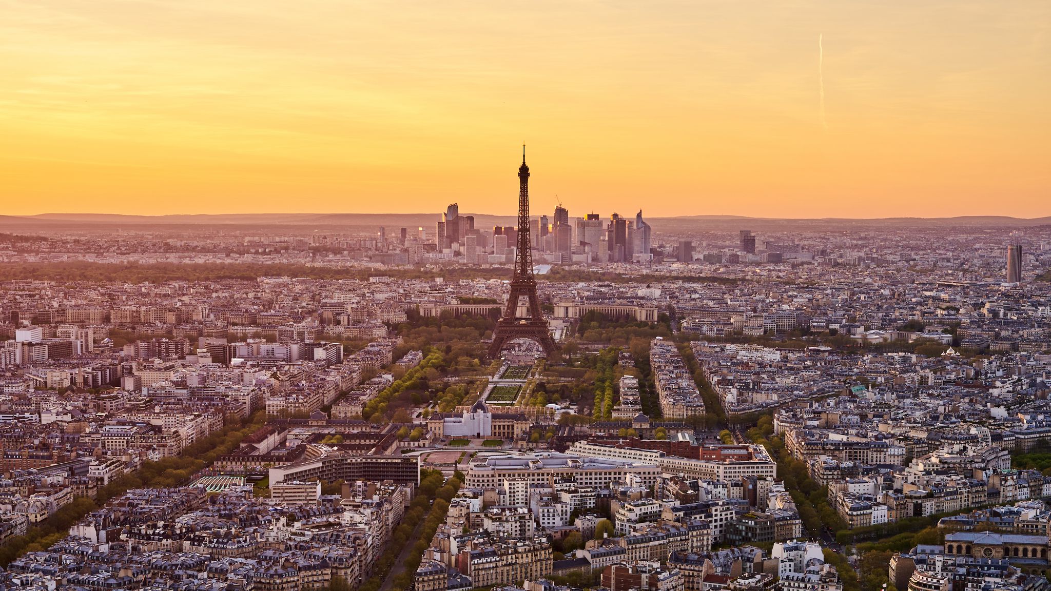 2048x1152 эйфелева башня, город, закат, улицы, архитектура, париж, франция обои ультраширокий монитор