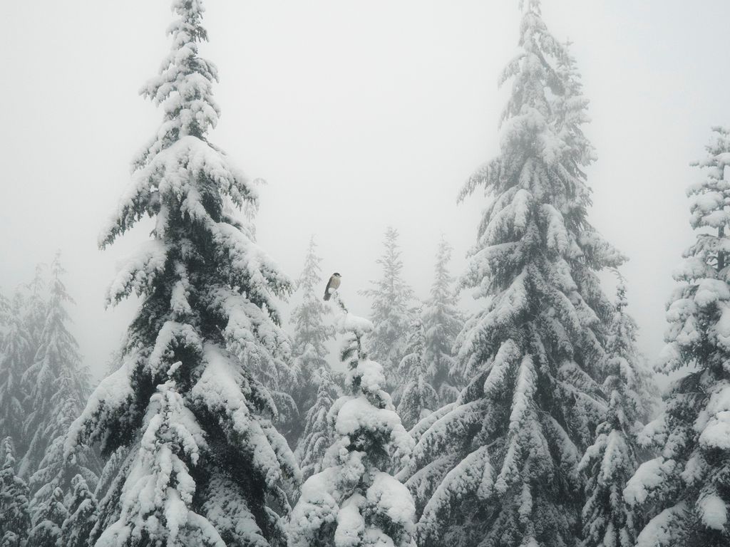 1024x768 ели, туман, снег, птица, зима обои стандарт 4:3