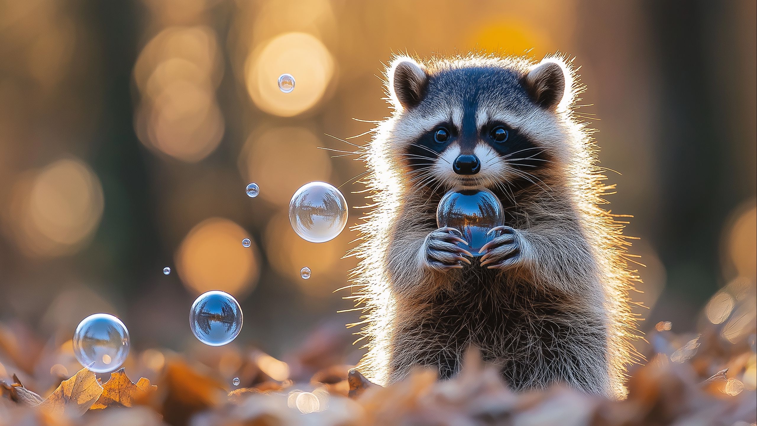 2560x1440 енот, пузыри, листья, осень обои 16:9