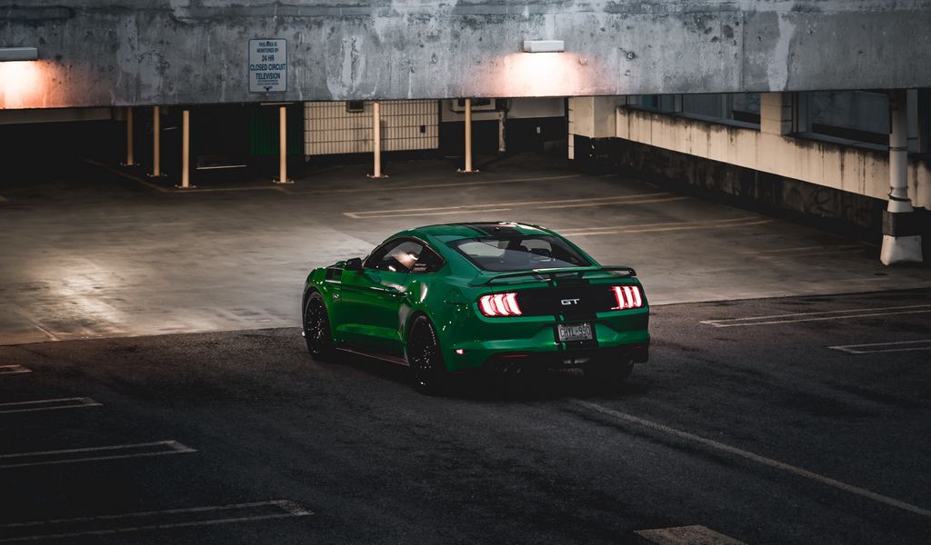1024x600 ford mustang, ford, машина, зеленый, спорткар, парковка обои нетбук, планшет