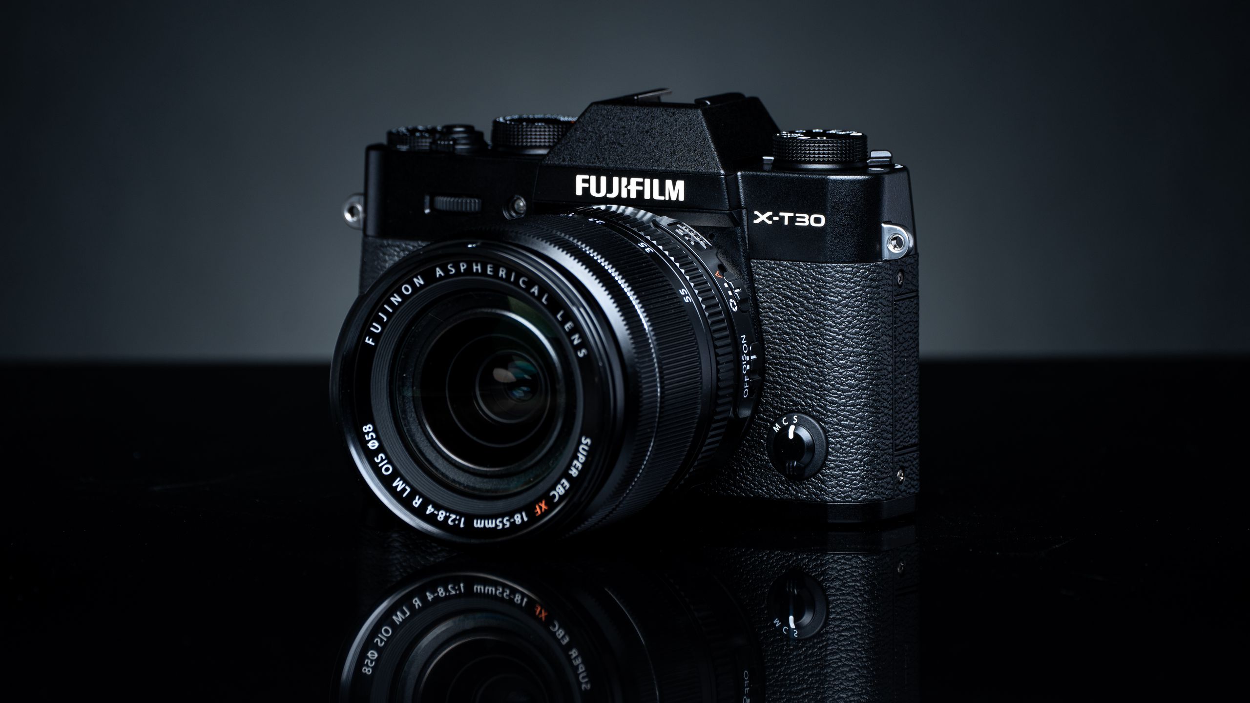2560x1440 фотоаппарат, объектив, отражение, черный обои 16:9
