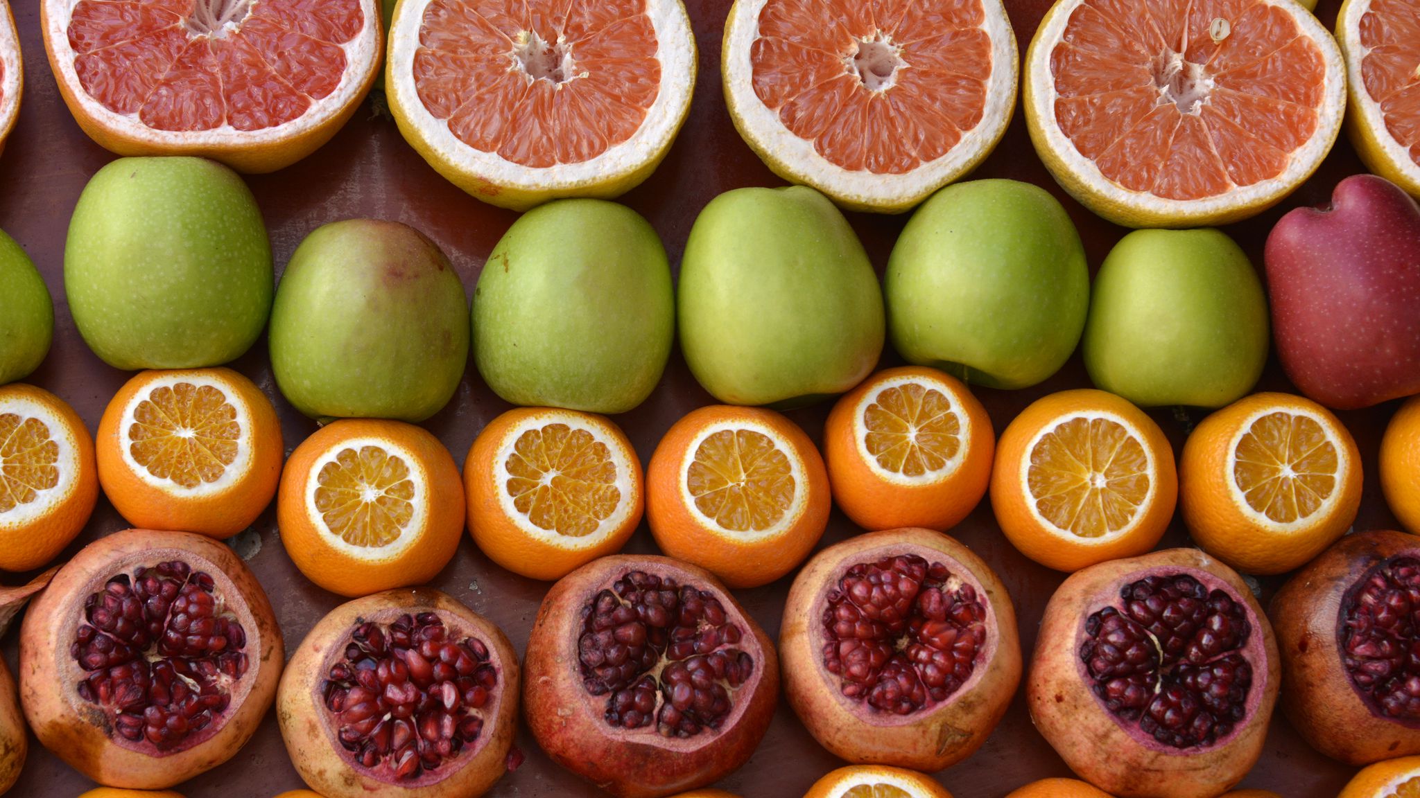 2048x1152 фрукты, яблоки, гранаты, апельсины, грейпфруты, спелый обои ультраширокий монитор