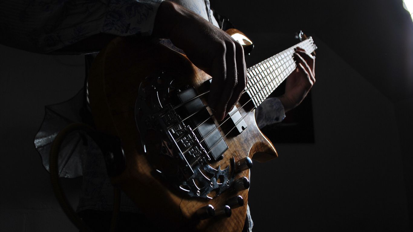 1366x768 гитара, гитарист, музыкальный инструмент, струны, бас гитара, темный обои планшет, ноутбук