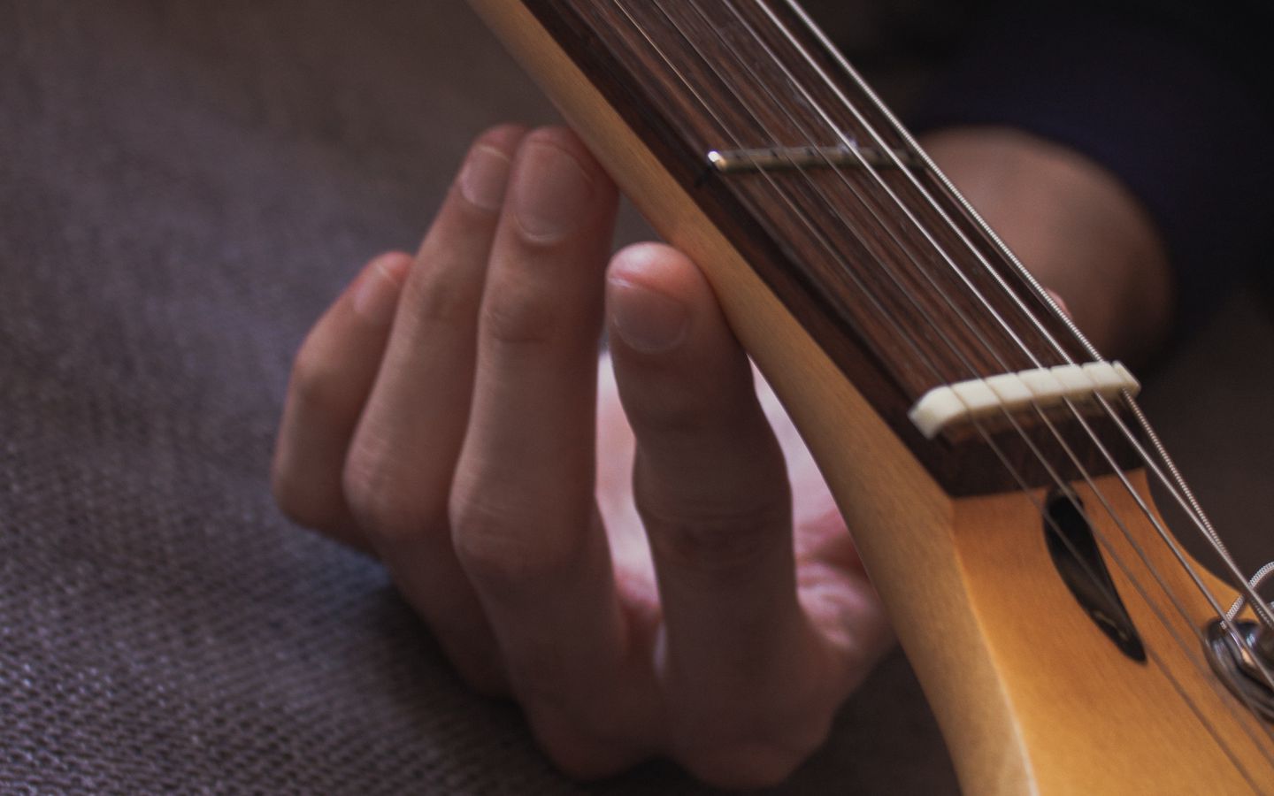 1440x900 гитара, гриф, струны, рука, музыкальный инструмент, музыка обои 16:10