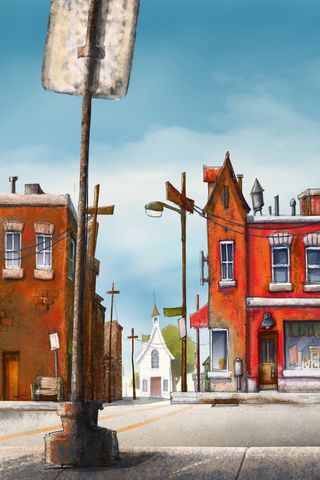 320x480 город, улица, арт, здания, дорожный знак, столб обои samsung galaxy ace gt-s5830, sony xperia e, miro, htc wildfire s, c, lg optimus