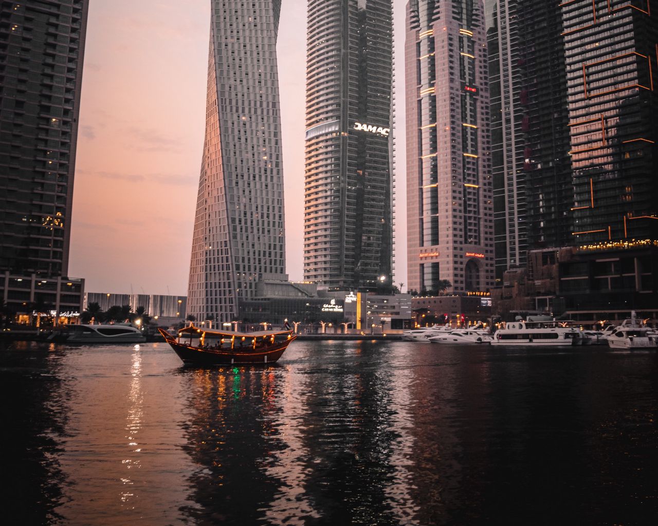 1280x1024 город, здания, лодки, берег, дубай, оаэ обои стандарт 5:4