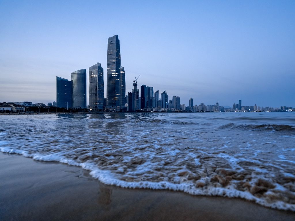 1024x768 город, здания, небоскребы, море, пляж, побережье обои стандарт 4:3