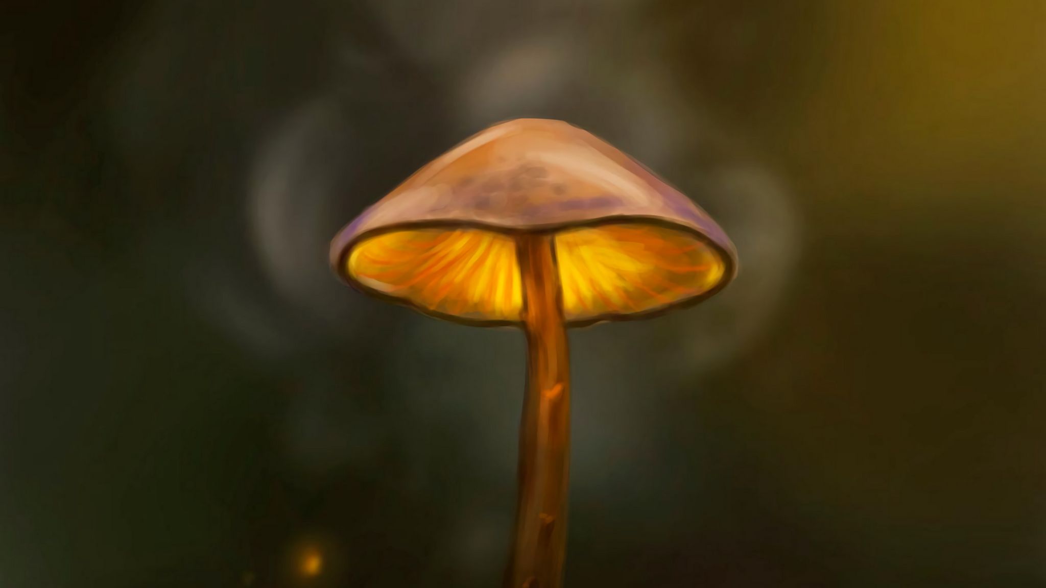 2048x1152 гриб, частицы, трава, арт обои ультраширокий монитор