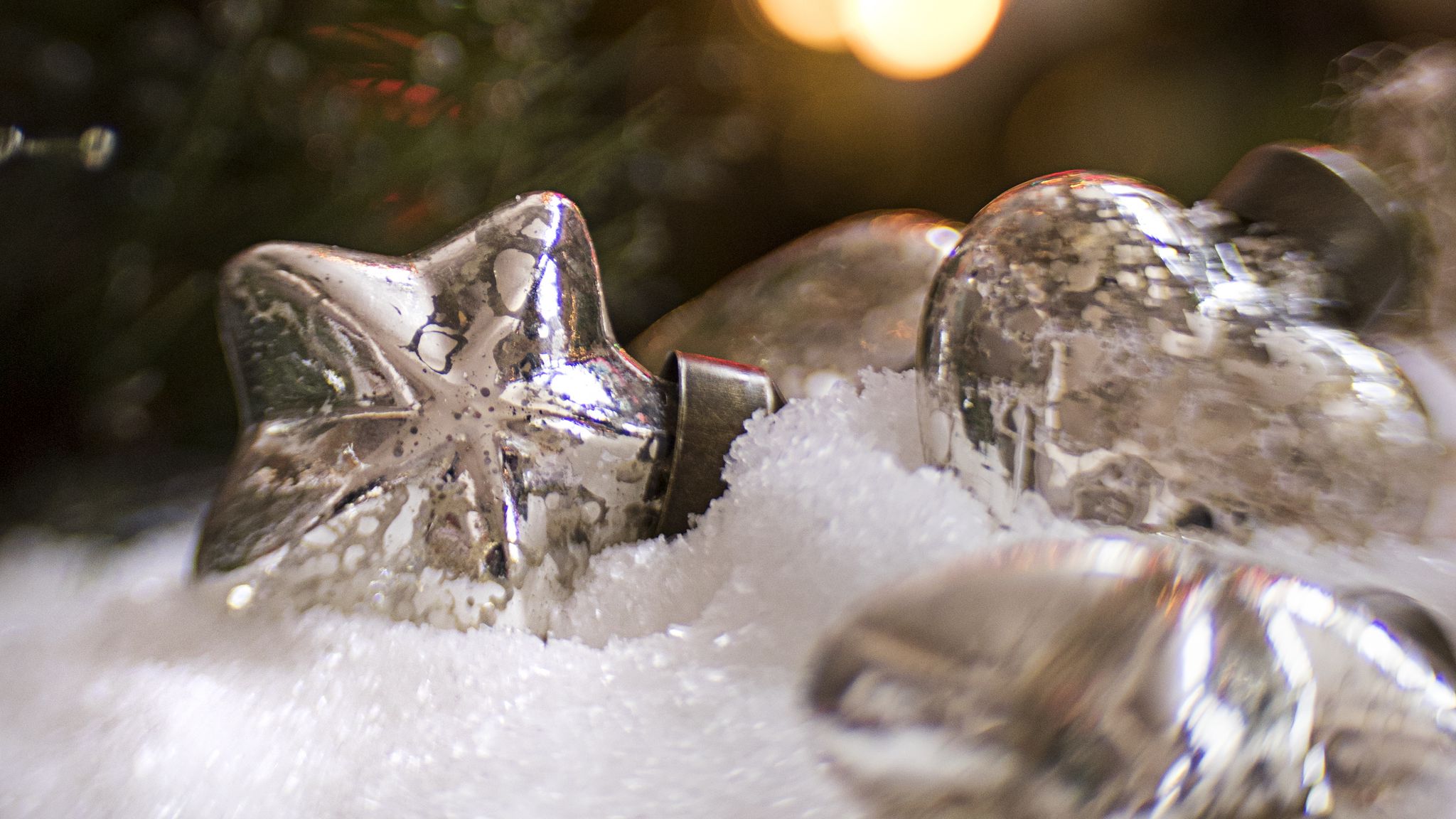 2048x1152 игрушки, блики, боке, снег, новый год, рождество обои ультраширокий монитор