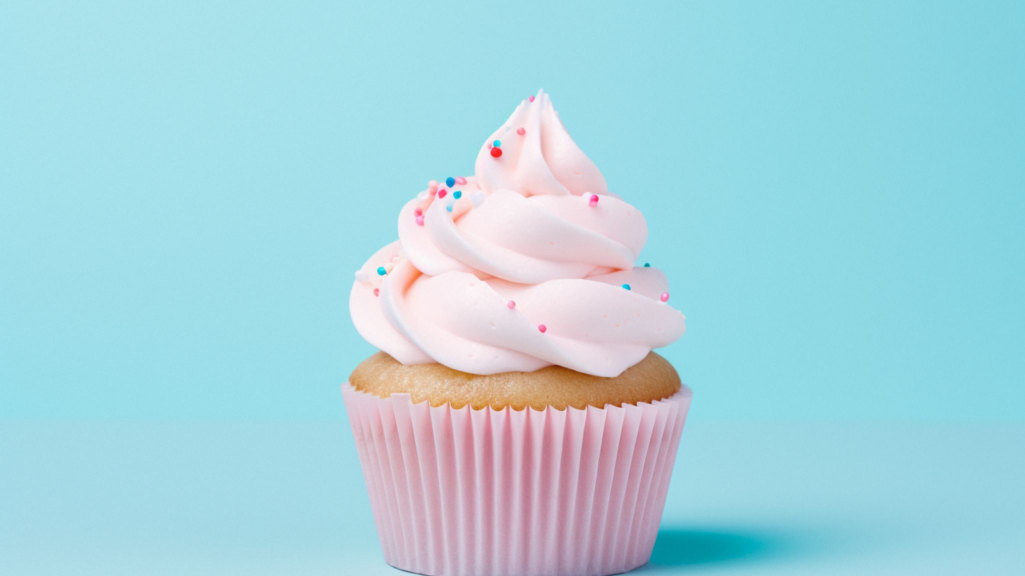 2048x1152 капкейк, топпинг, взбитые сливки, десерт, синий фон обои ультраширокий монитор