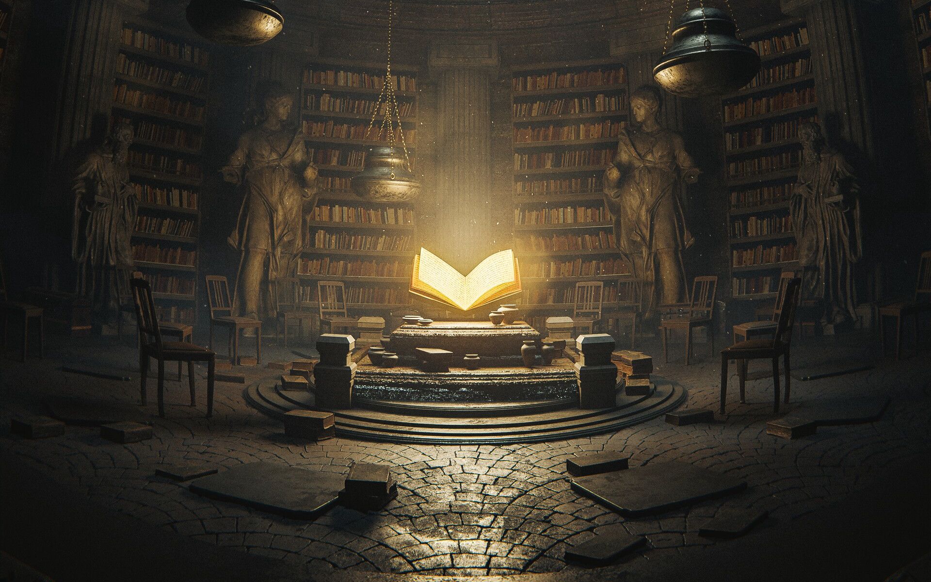 1920x1200 книга, статуи, библиотека, арт обои 16:10