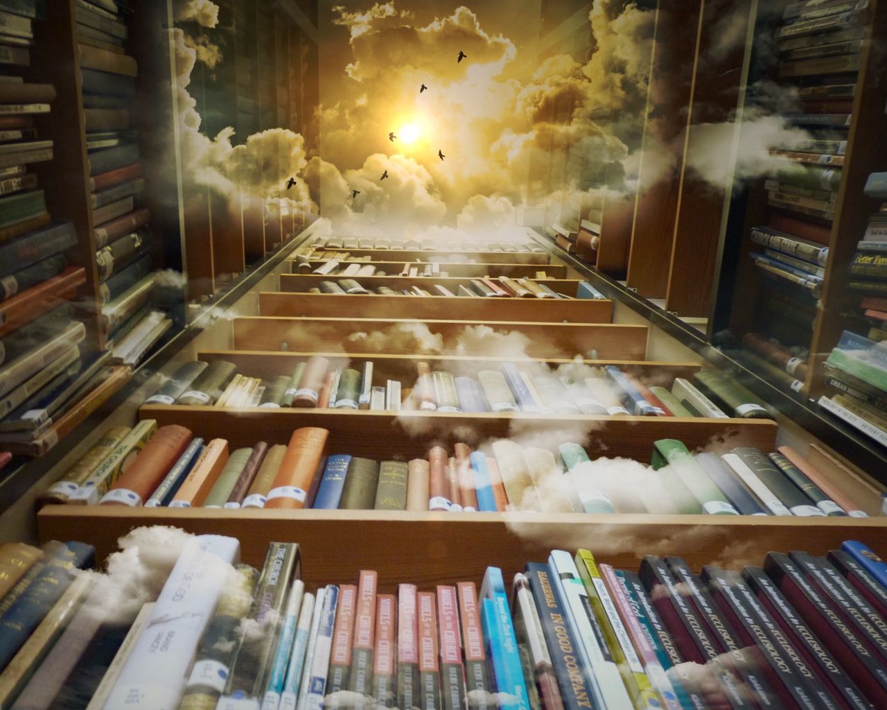 1280x1024 книги, библиотека, фотошоп, полки, облака, чтение, полет обои стандарт 5:4
