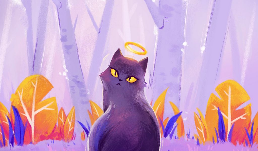 1024x600 кошка, нимб, арт, фиолетовый обои нетбук, планшет