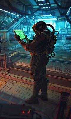 240x400 космонавт, планшет, космическая станция, sci-fi, арт обои nokia asha 311, samsung galaxy 580, omnia, lg kp500
