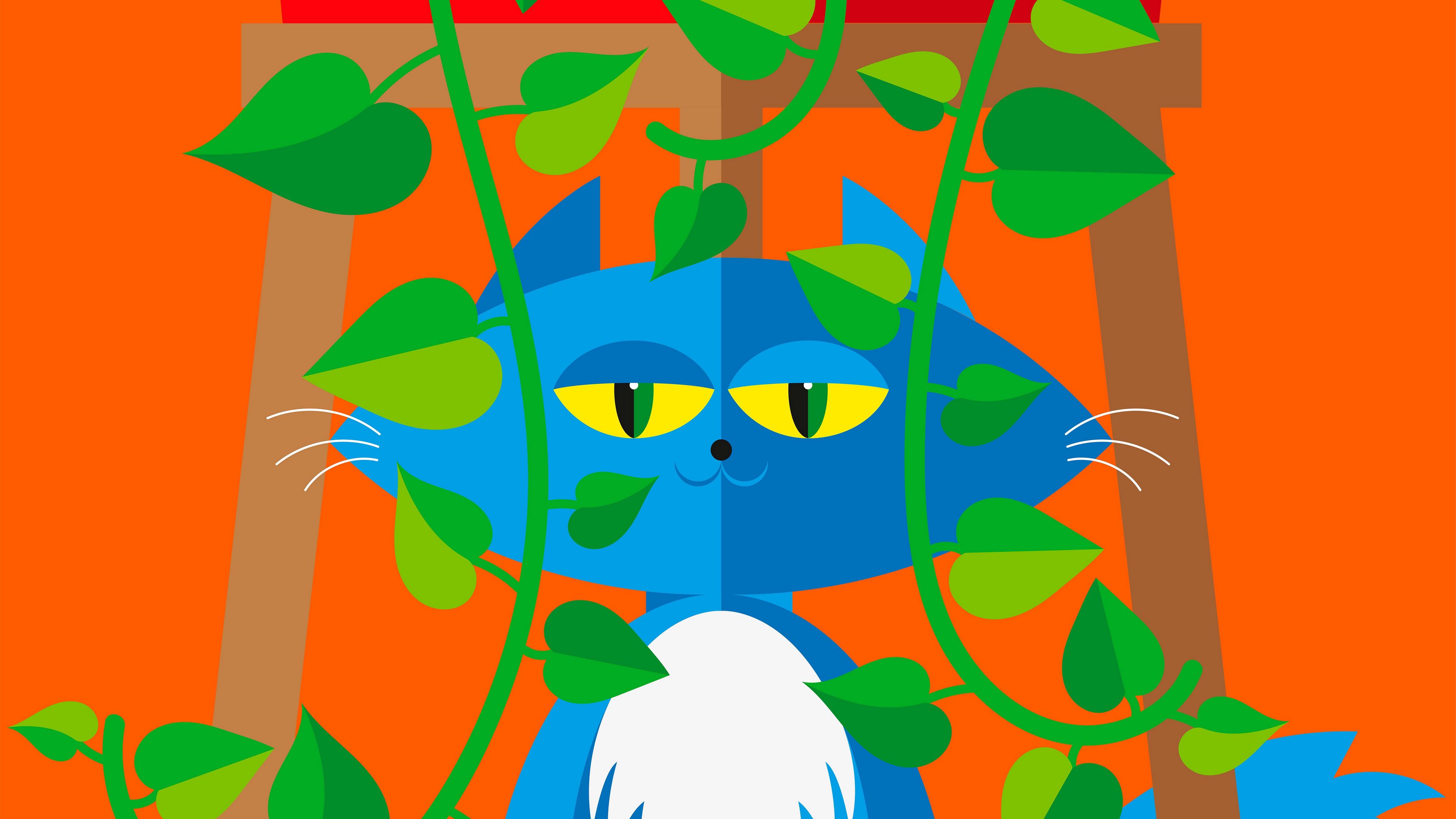 3840x2160 кот, питомец, листья, растение, вектор, арт, яркий обои 4k uhd 16:9