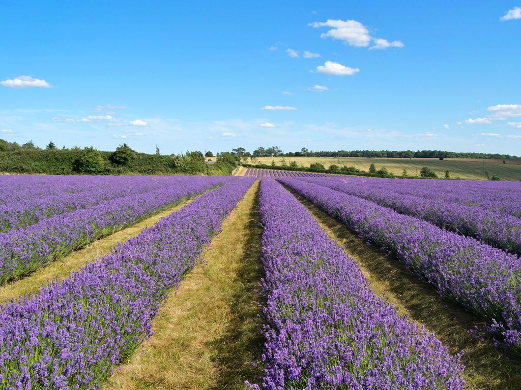 1024x768 лаванда, поле, цветы, кусты, облака, пейзаж обои стандарт 4:3