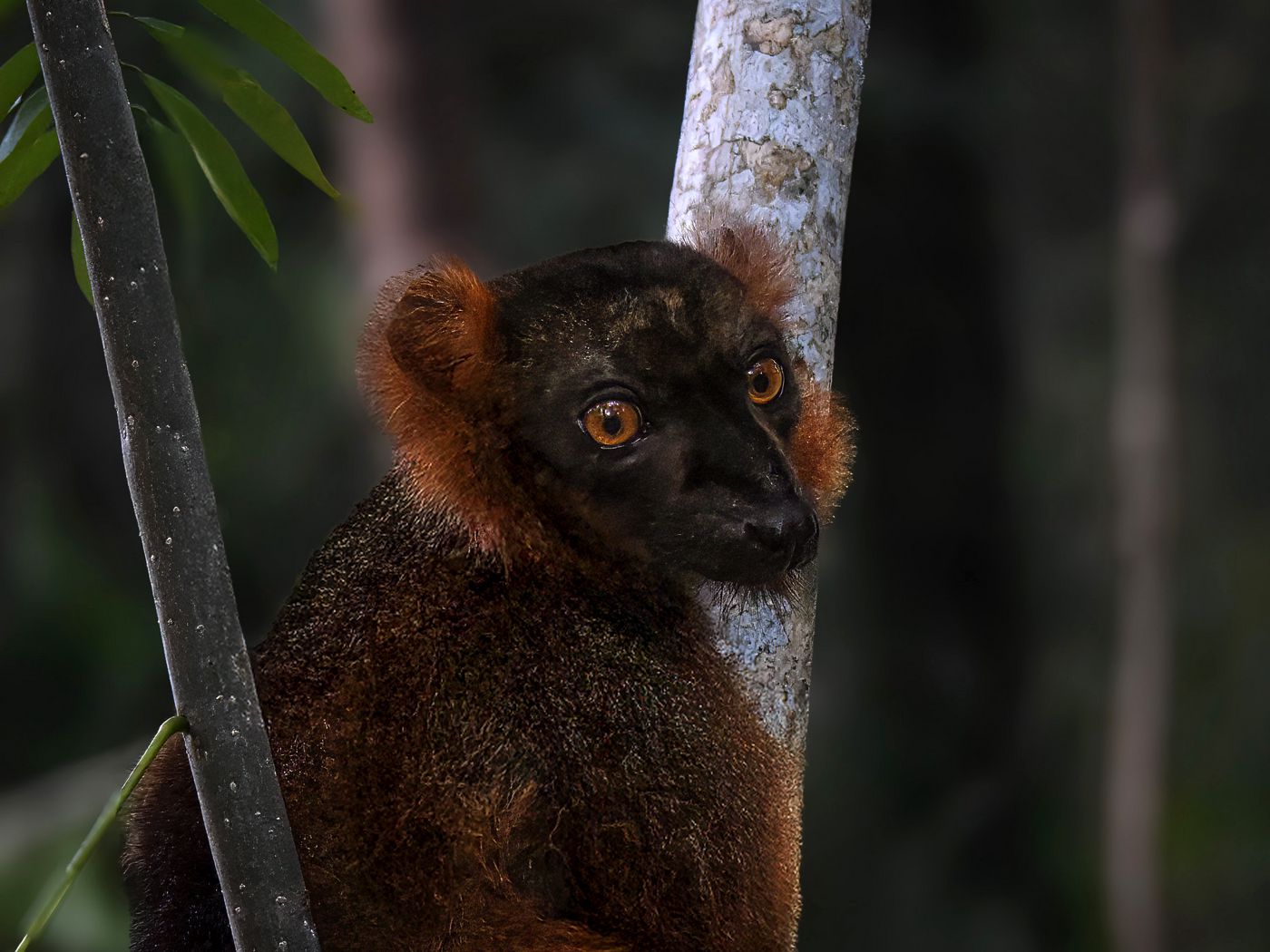 1400x1050 лемур, ветки, деревья, животное, блюр обои стандарт 4:3
