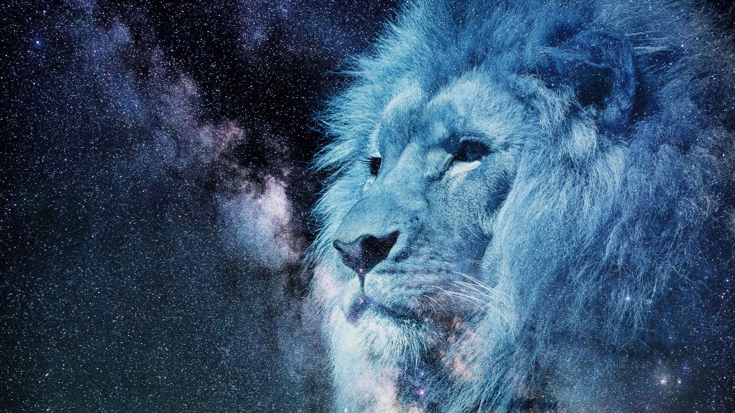 2560x1440 лев, морда, звездное небо, звезды, фотошоп, король зверей, хищник обои 16:9