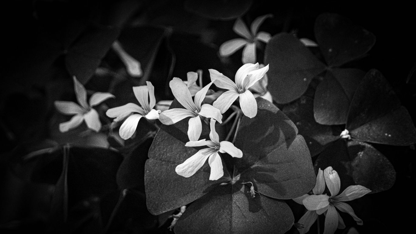 1366x768 листья, лепестки, цветы, растения, темный, чб обои планшет, ноутбук