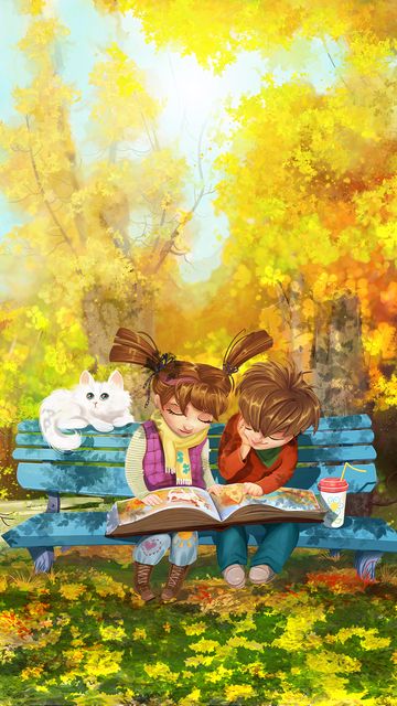 360x640 мальчик, девочка, кот, скамейка, парк, мило обои nokia n8, c5, c6, c7, e7, x6 nokia 5800, 5230, 5228, sony ericsson vivaz