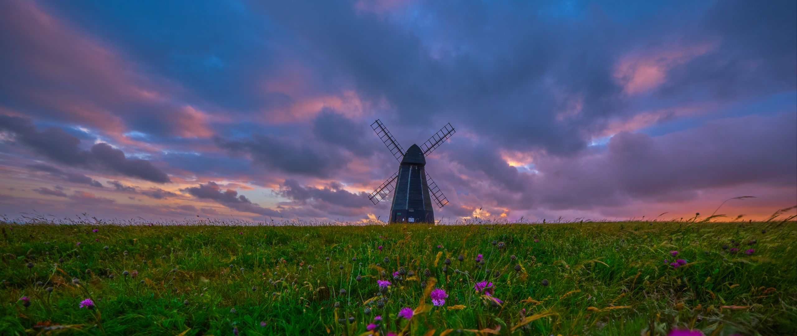 2560x1080 мельница, поле, горизонт, облака, природа, цветы обои два монитора 1080p
