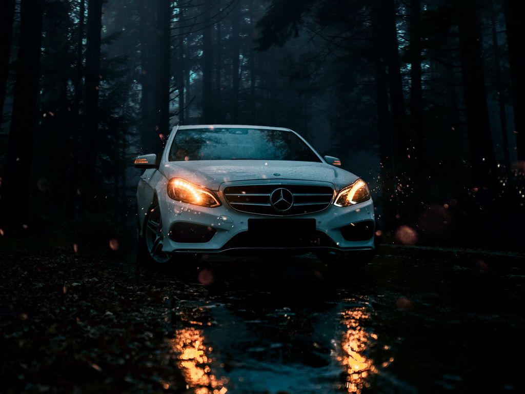 1024x768 mercedes, автомобиль, белый, вид спереди, лес обои стандарт 4:3
